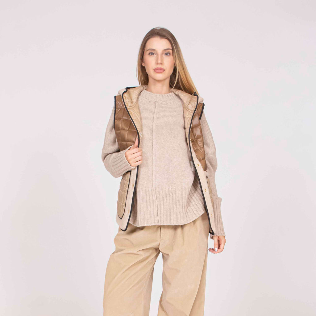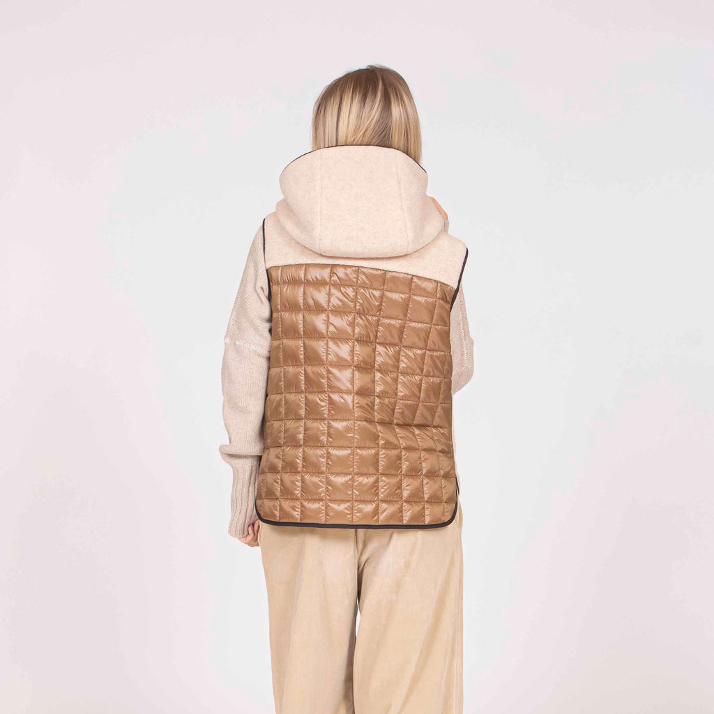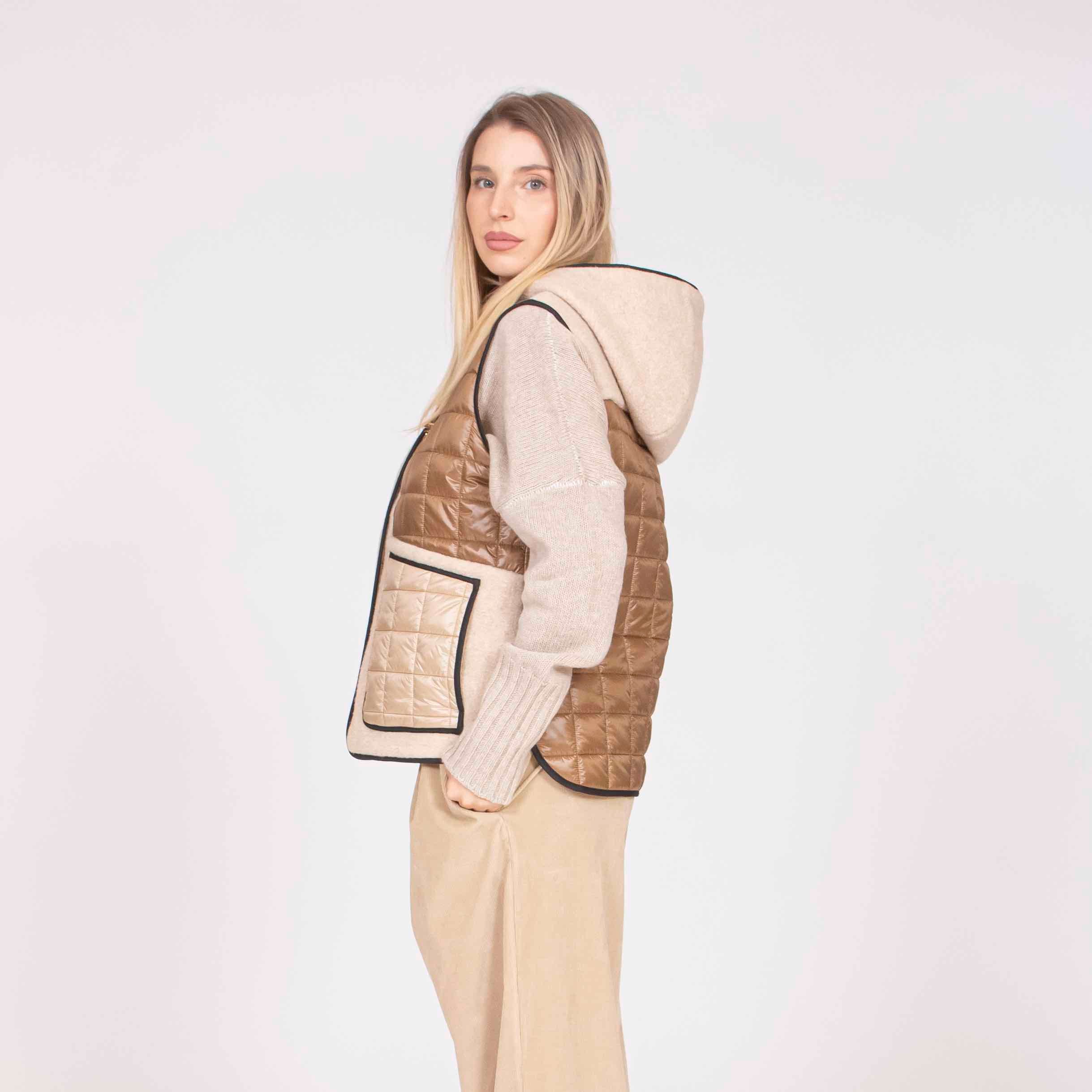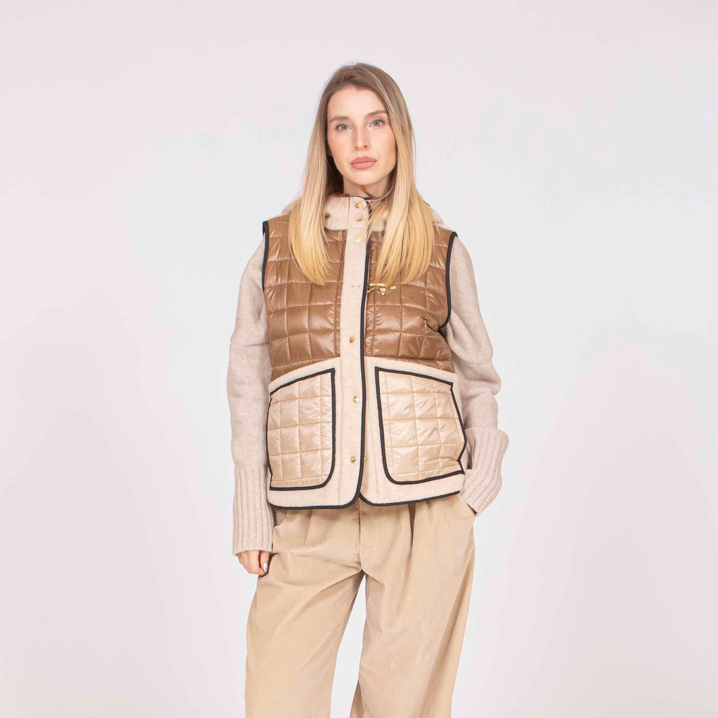 Gilet realizzato in tessuto tecnico trapuntato a quadri con imbottitura in ovatta. Questo modello, caratterizzato da inserti e cappuccio in shearling, presenta tasche applicate in nylon trapuntato. Il capo è completato da una chiusura con automatici personalizzati e l'iconico gancio Fay all'altezza del petto.