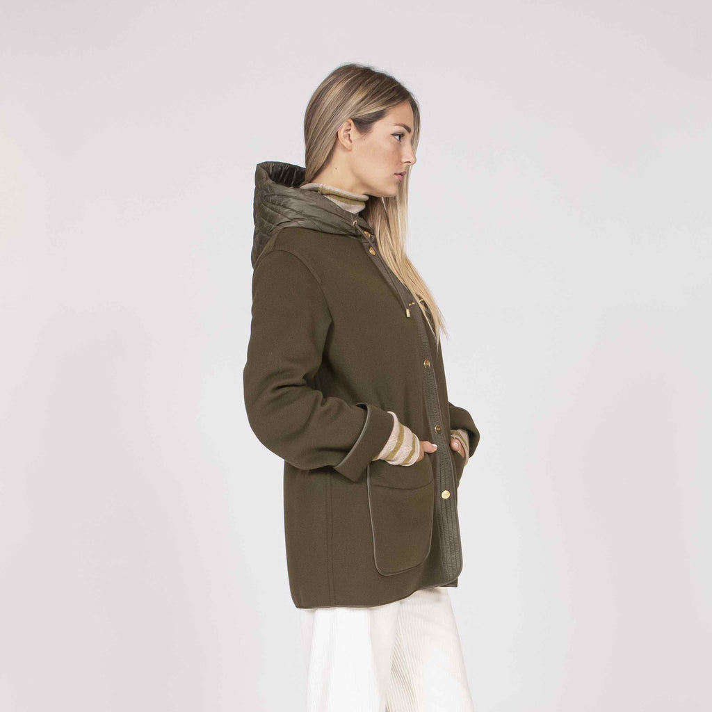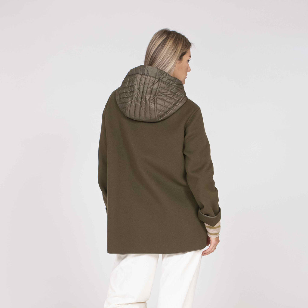 Caban bimateriale realizzato in lana e cashmere, con cappuccio e tasche a toppa. Questo modello sfoderato è caratterizzato da un cappuccio e dettagli in nylon trapuntato.