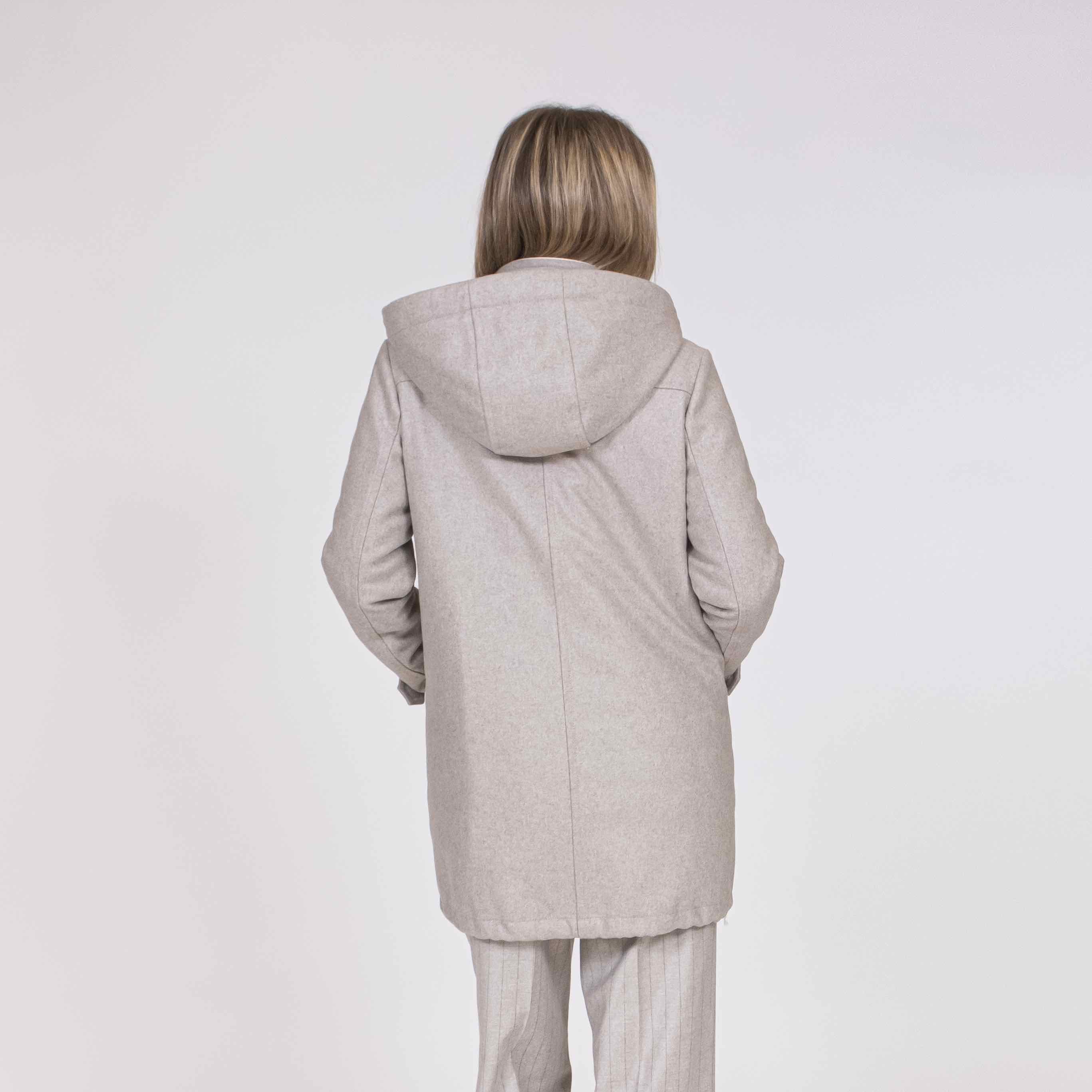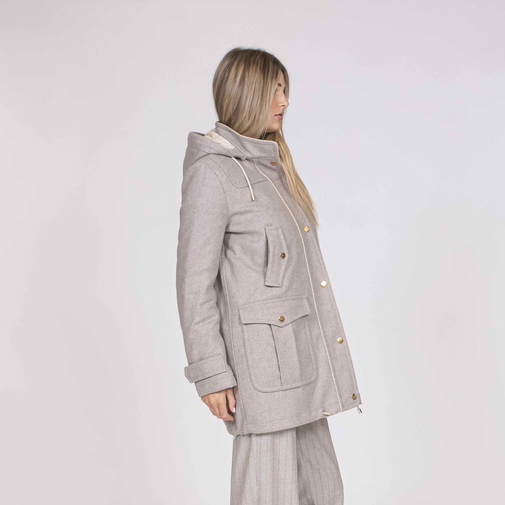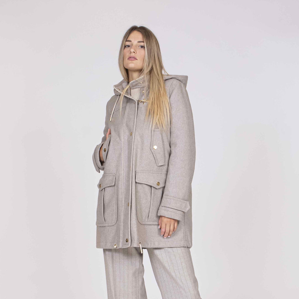 Parka realizzato in panno di lana misto cashmere, con cappuccio removibile.