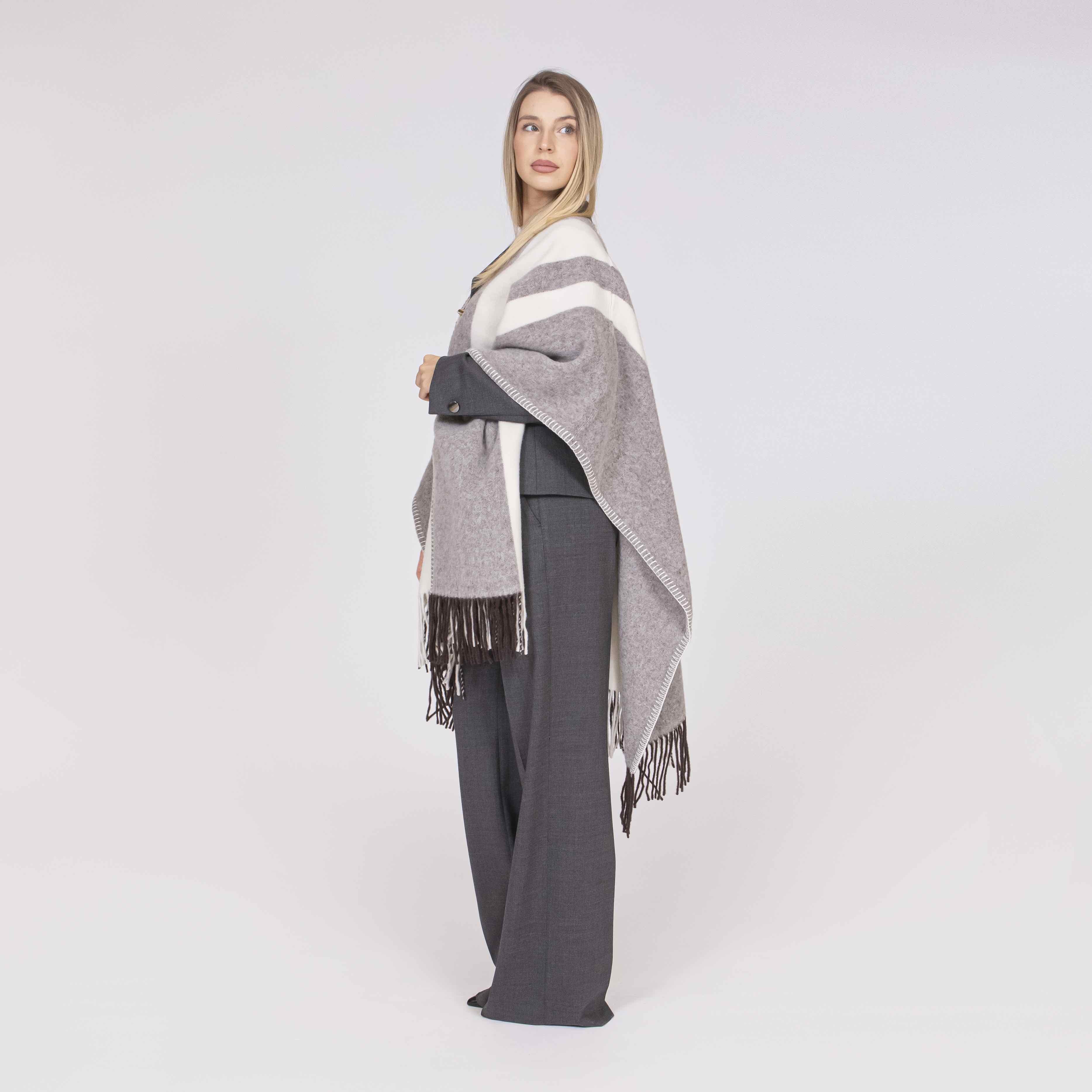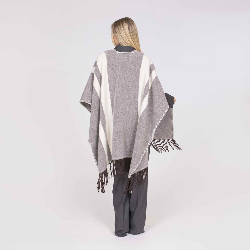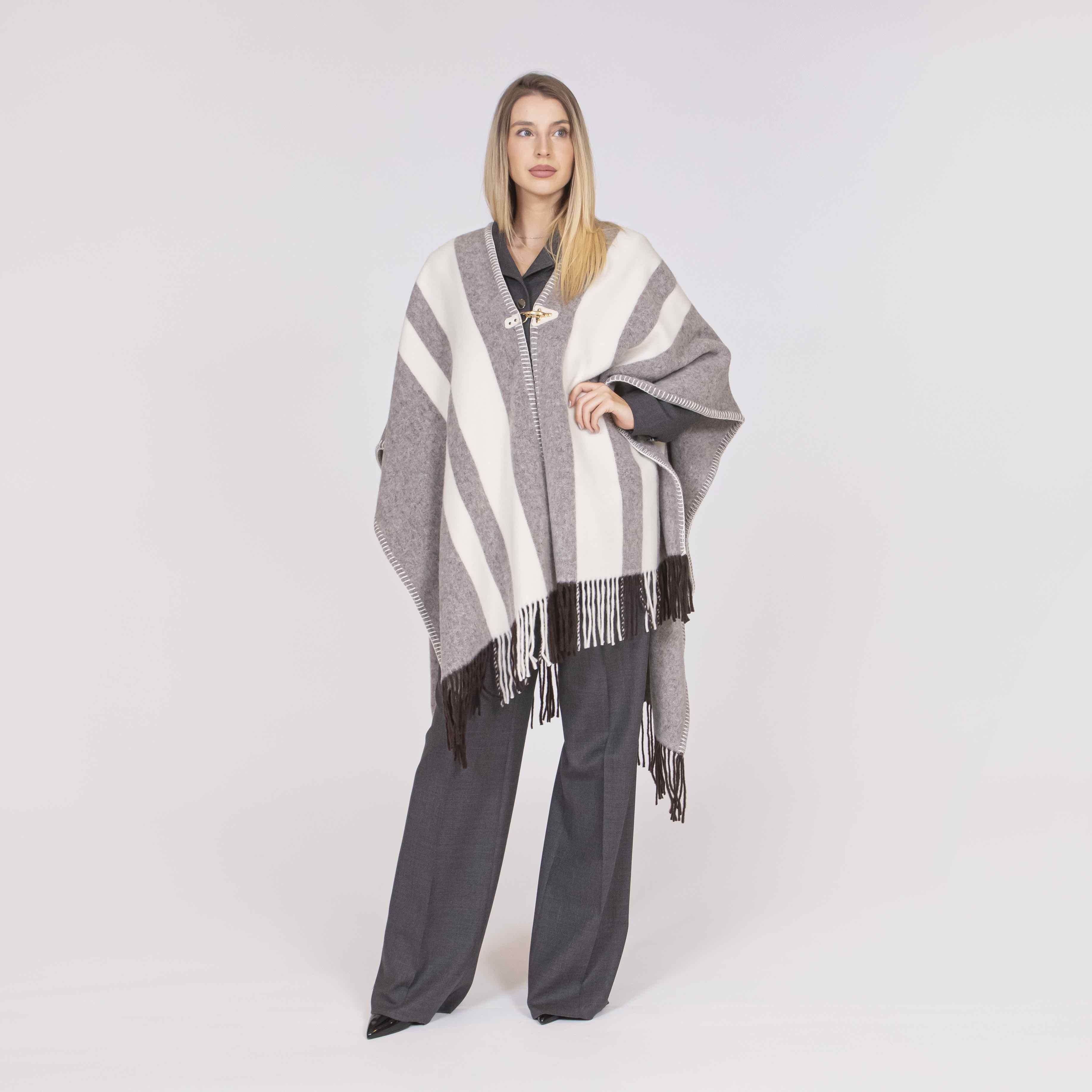 Poncho realizzato in lana bicolor con frange e bordi rifiniti da eleganti infilature. Il modello è caratterizzato da una chiusura con iconico gancio Fay, fissato con dettagli in crosta.