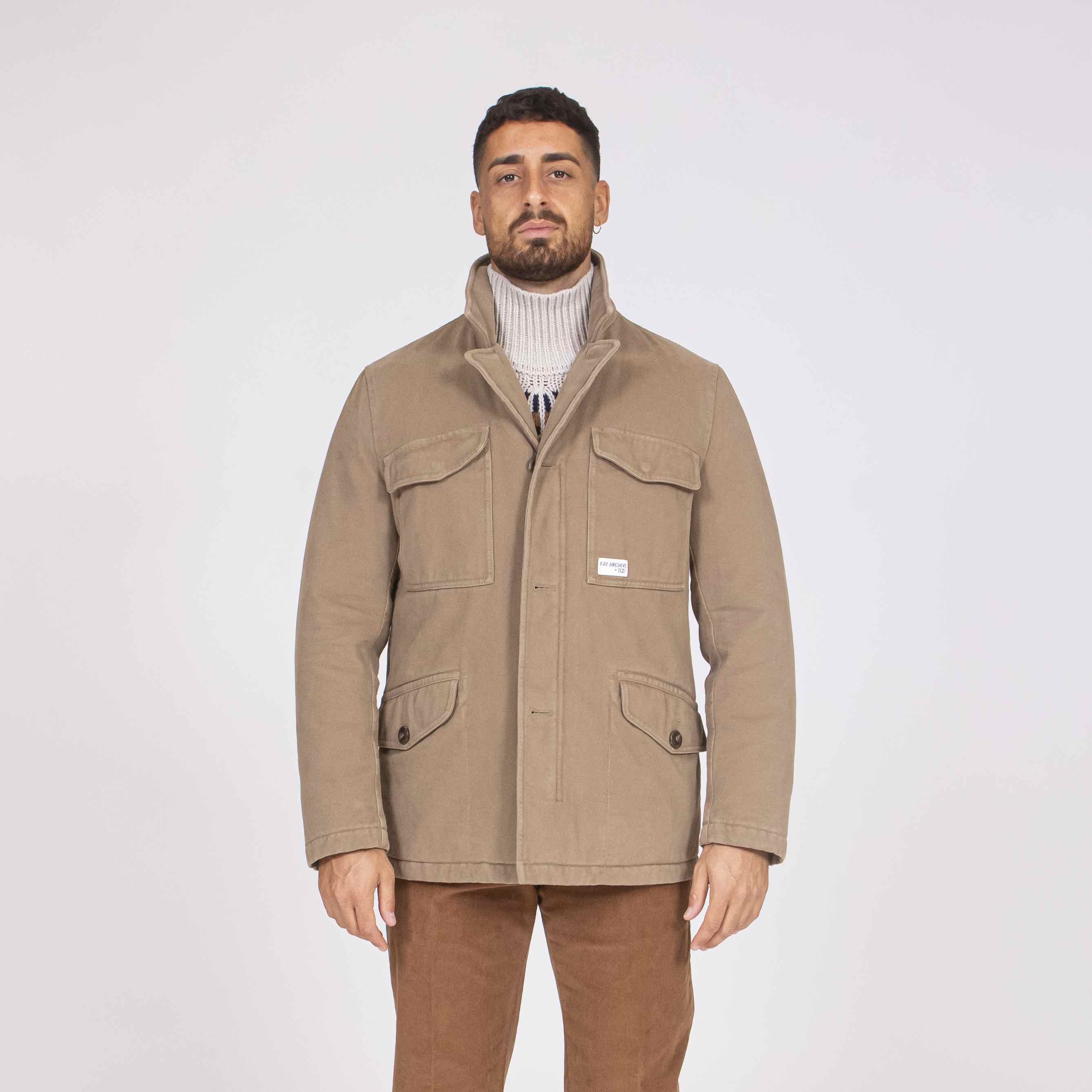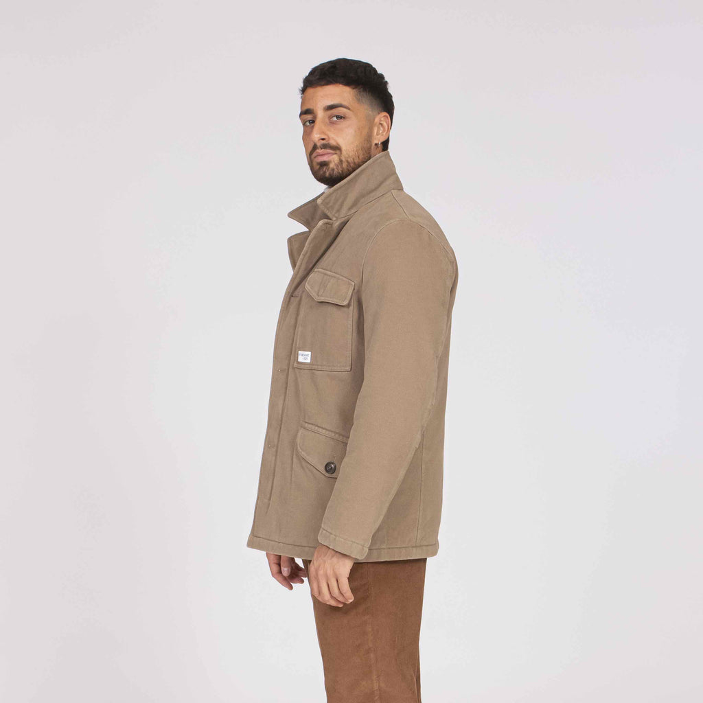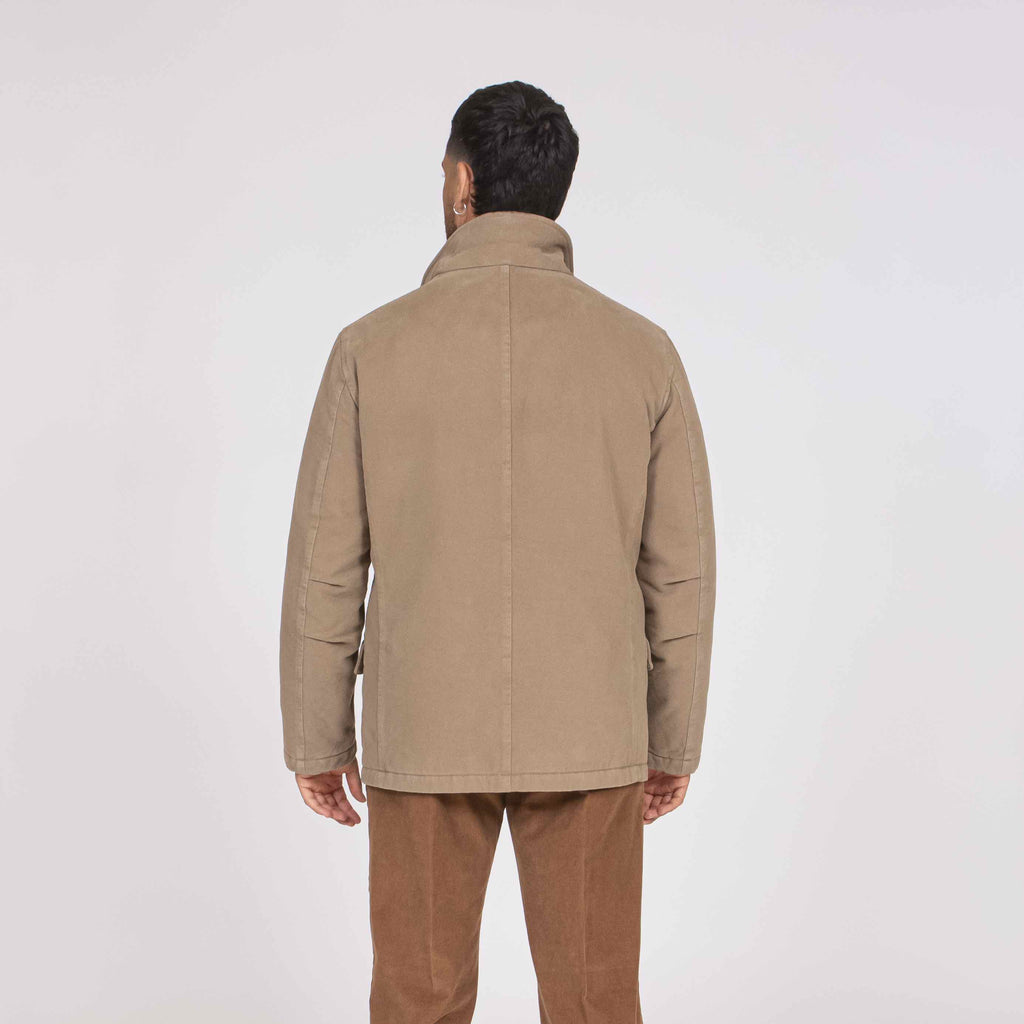 Field Jacket realizzata in panno misto lana effetto délavé, con collo revers. Questa versione imbottito in ovatta ha una fodera trapuntata a cipolla.