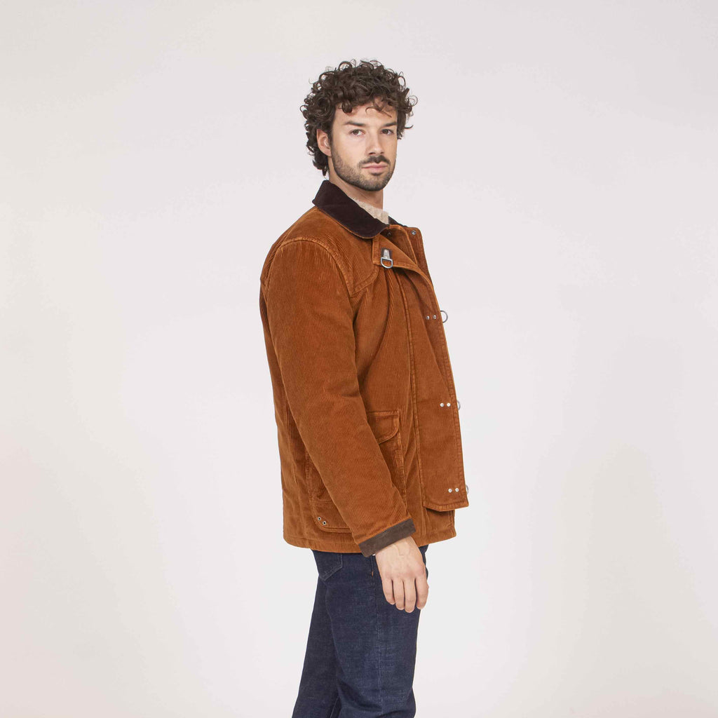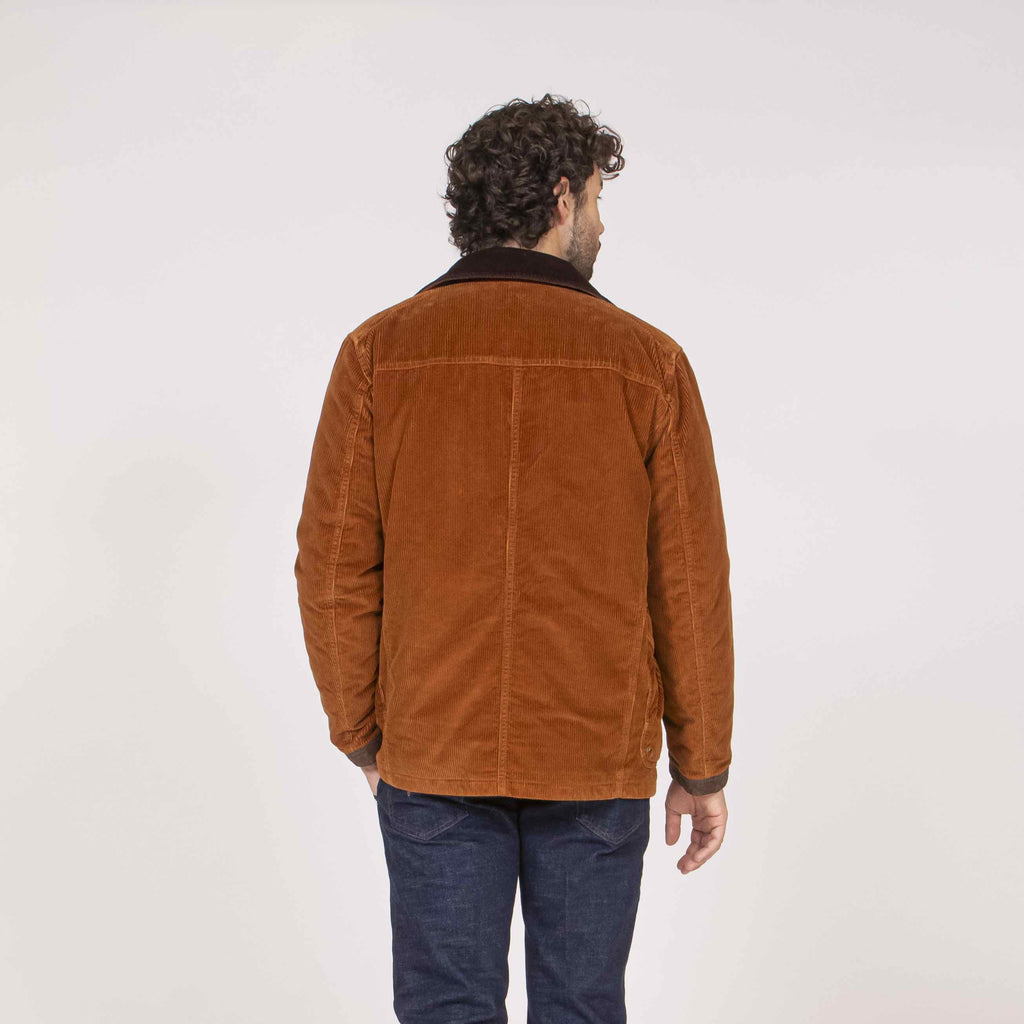 Questa versione, realizzata in velluto a coste stone washed effetto used, presenta un'imbottitura in ovatta e una fodera trapuntata con motivo cipolla.