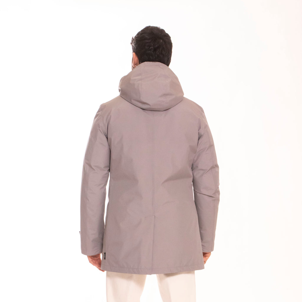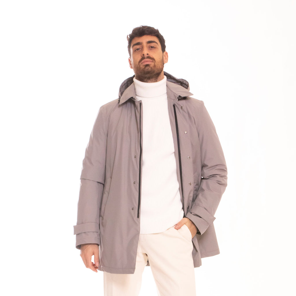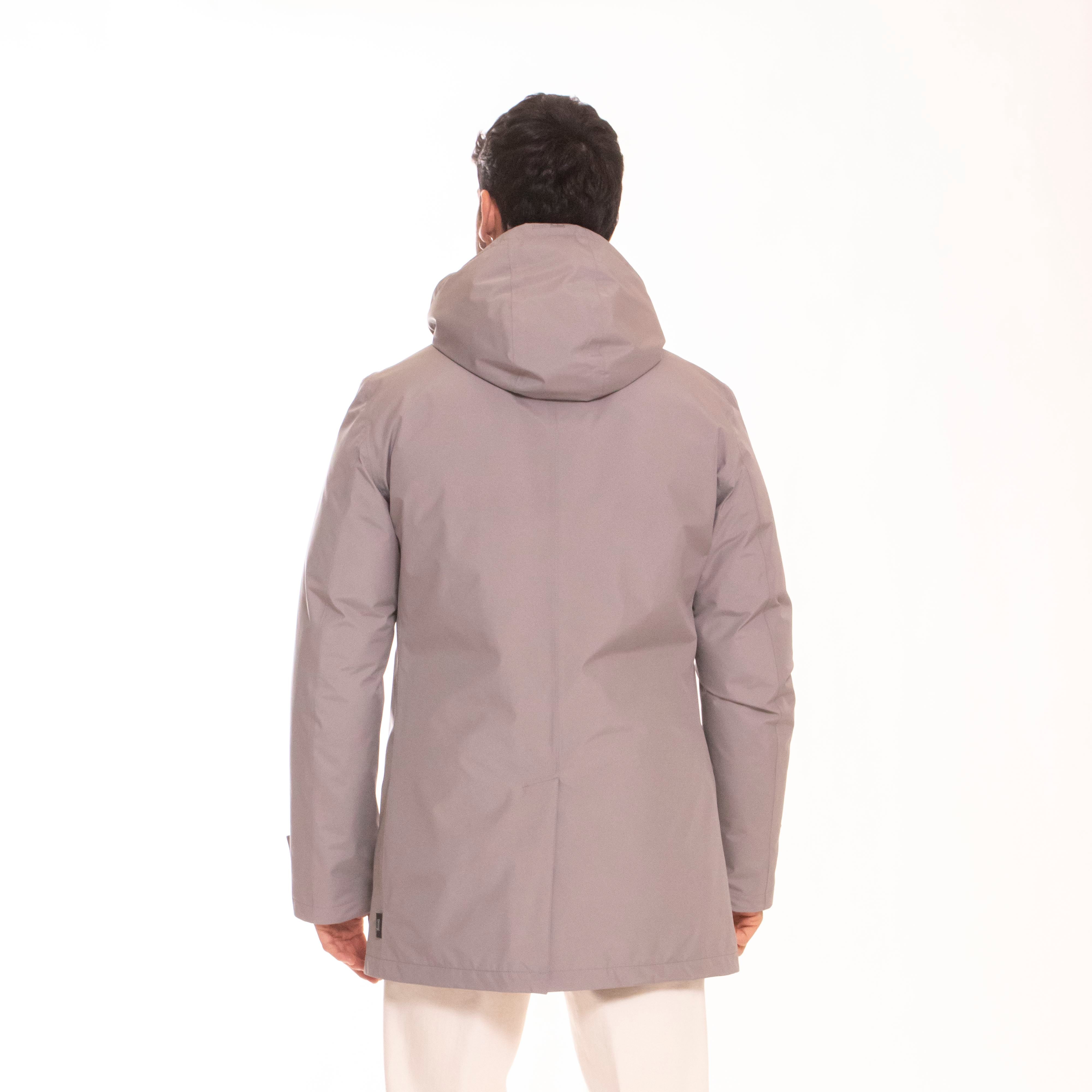 Il capo interpreta le esigenze dell'uomo contemporaneo perché combina il design classico d'ispirazione sartoriale con una costruzione modulabile: il cappuccio può essere indossato o rimosso in base al clima e alle scelte di stile.