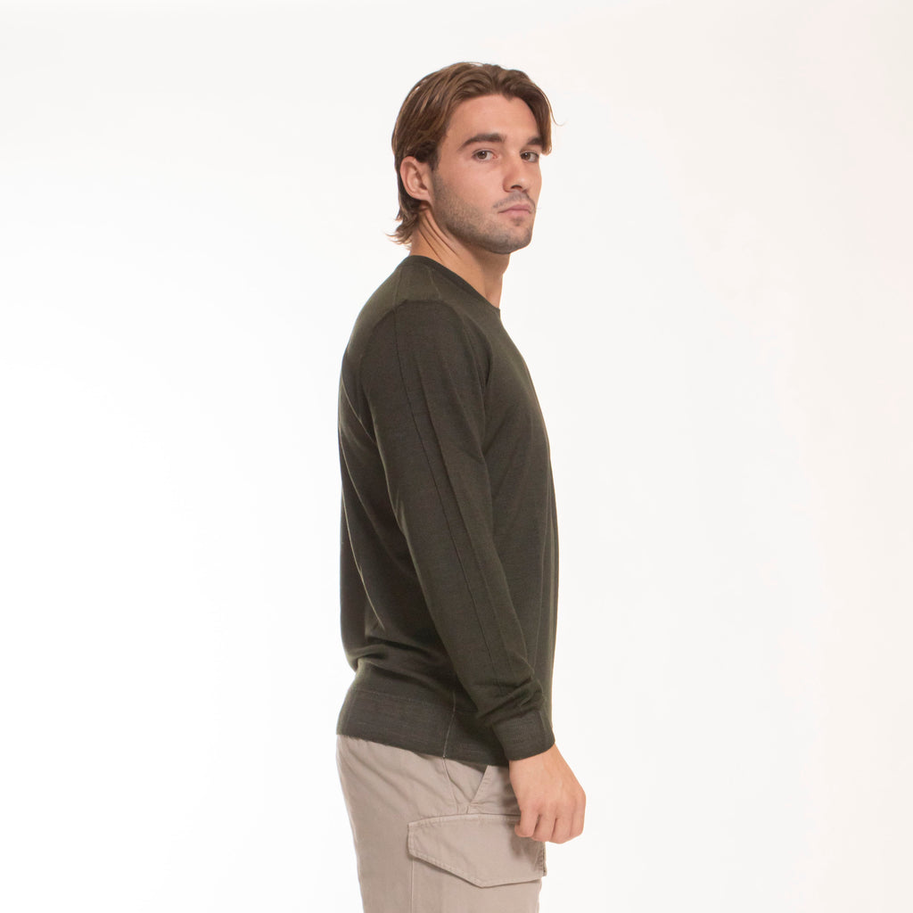 Maglione girocollo realizzato in lana merino. Il processo di tintura Fast Dyed impedisce al colore di penetrare nelle fibre in modo uniforme, conferendo un aspetto destrutturato mélange. Finezza 14.