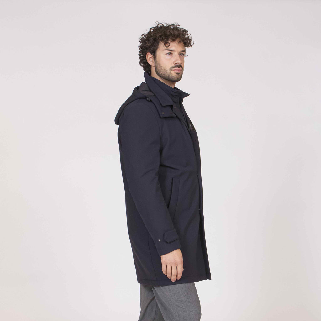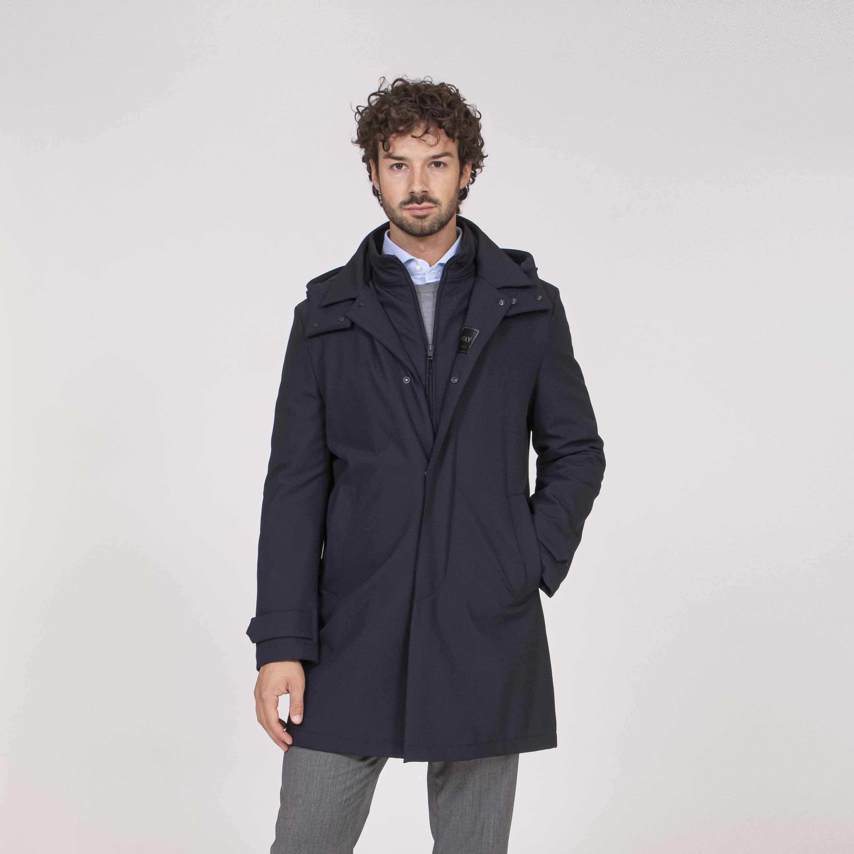 Morning Coat travel realizzato in jersey stretch con trattamento antigoccia e cappuccio removibile.