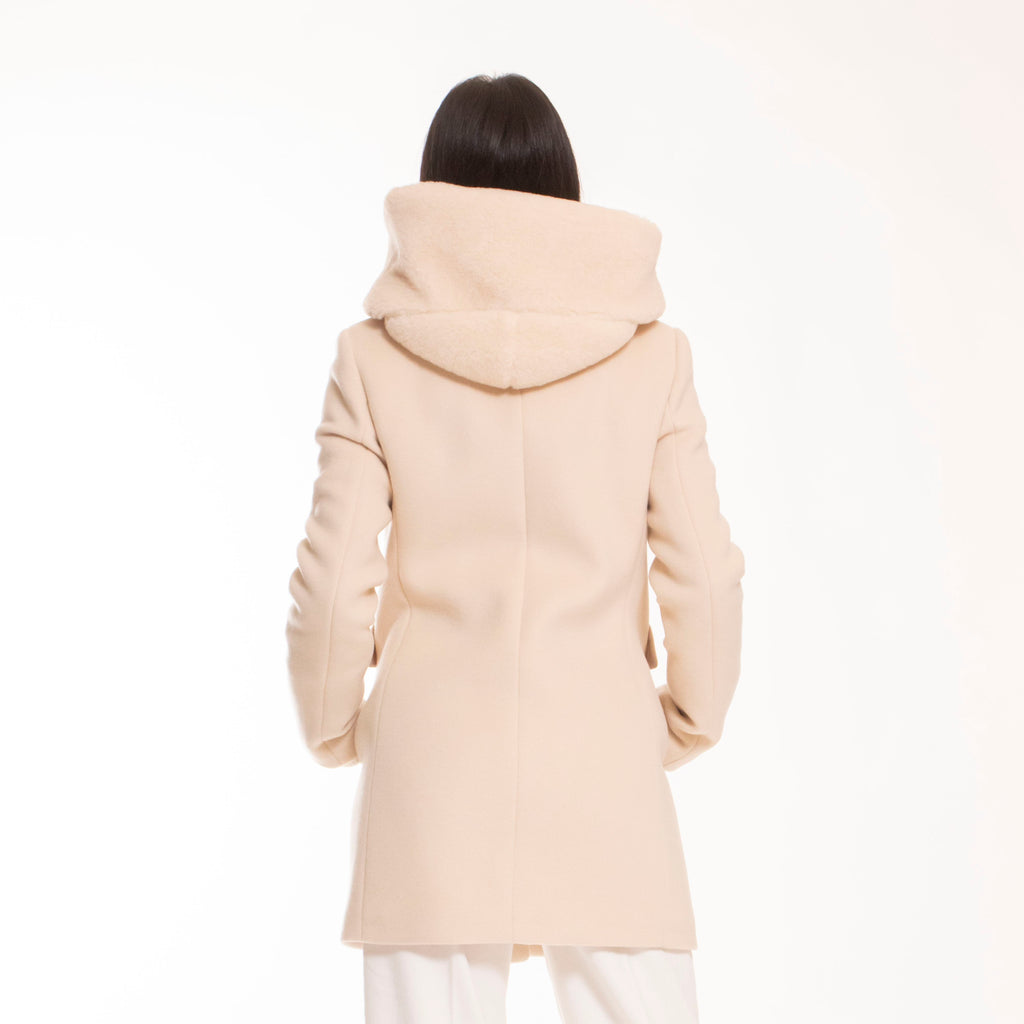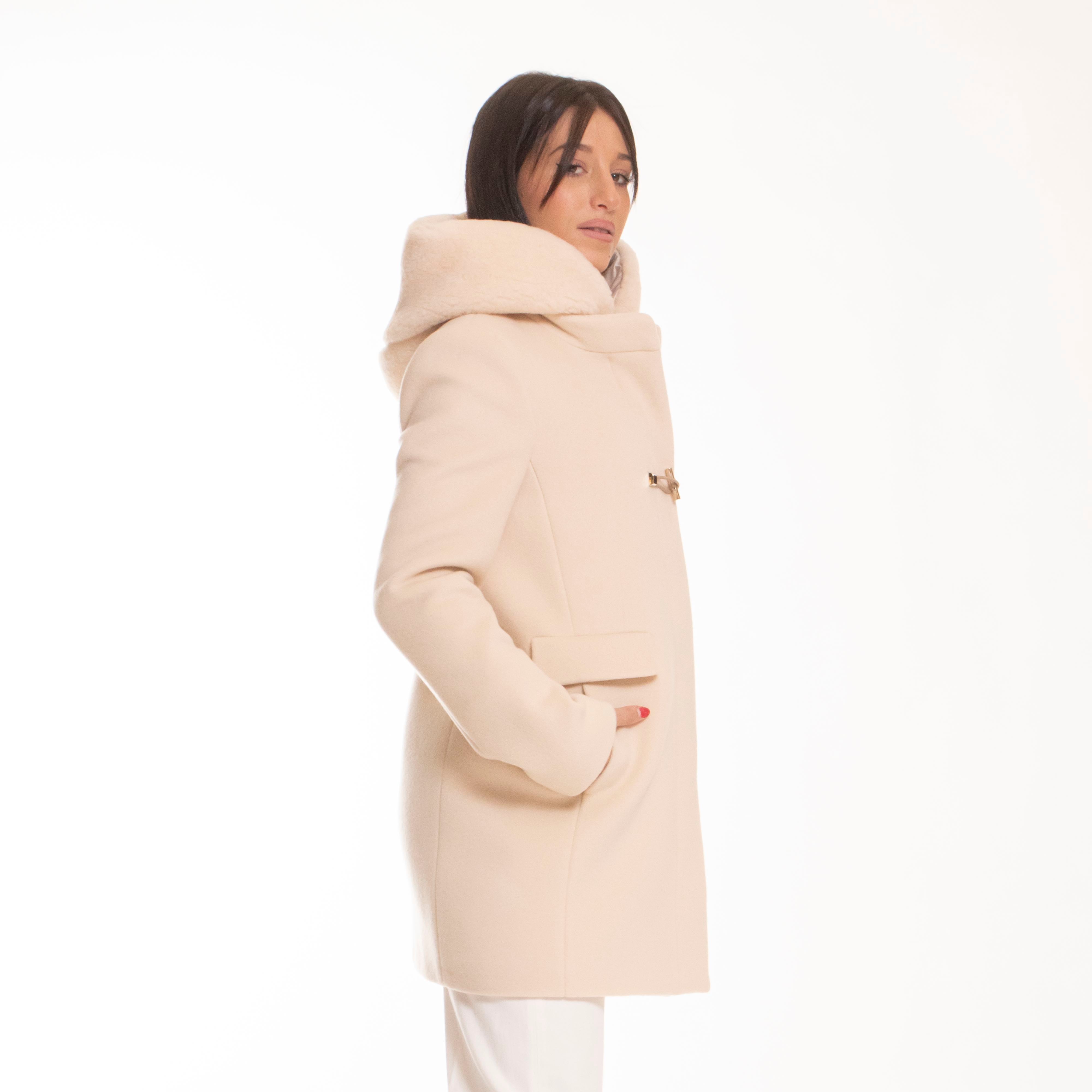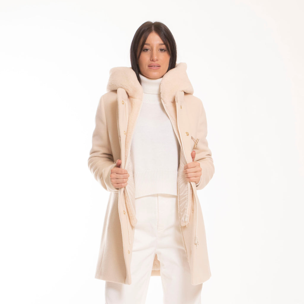 In panno misto lana e cashmere, con pettorina e cappuccio in pile effetto shearling, è dotato di tasche con patta a doppio ingresso, chiusura con zip, automatici nascosti e alamaro Fay. È caratterizzato da un'etichetta interna con il nome del capo.