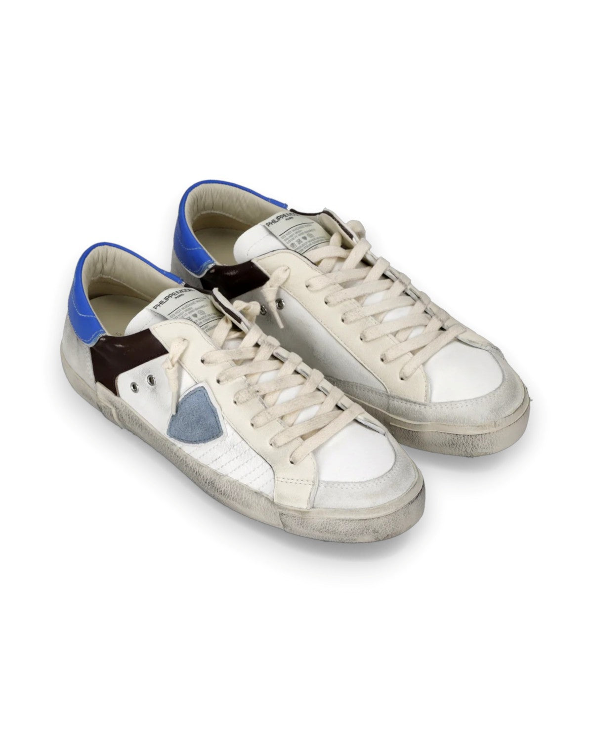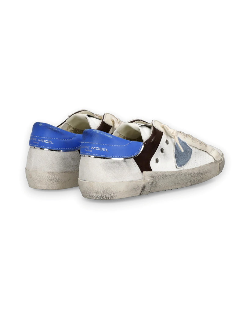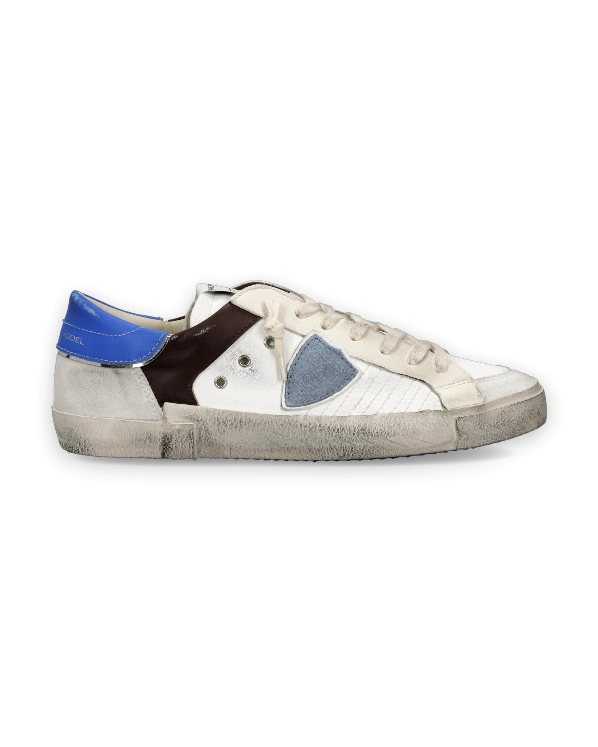 Essenziale per completare i look easy chic in città, la sneaker Prsx si presenta con tomaia in vitello con trattamento used e dettagli a contrasto per una nota pop, come spoiler e scudo blu. Il risultato è dinamico e maschile, perfetto per i jeans o per gli abiti di stagione. La fasciatura laterale della suola è realizzata artigianalmente, con sporcature per un effetto vissuto.
