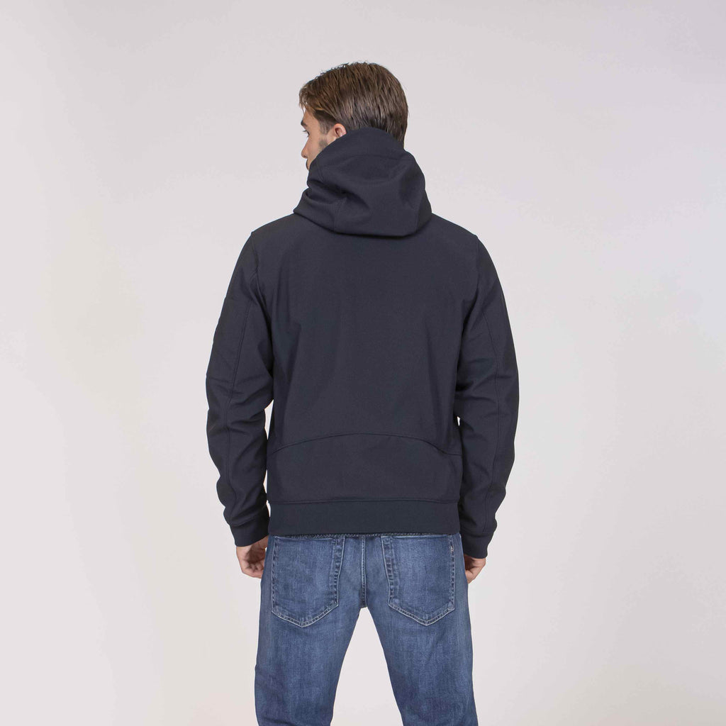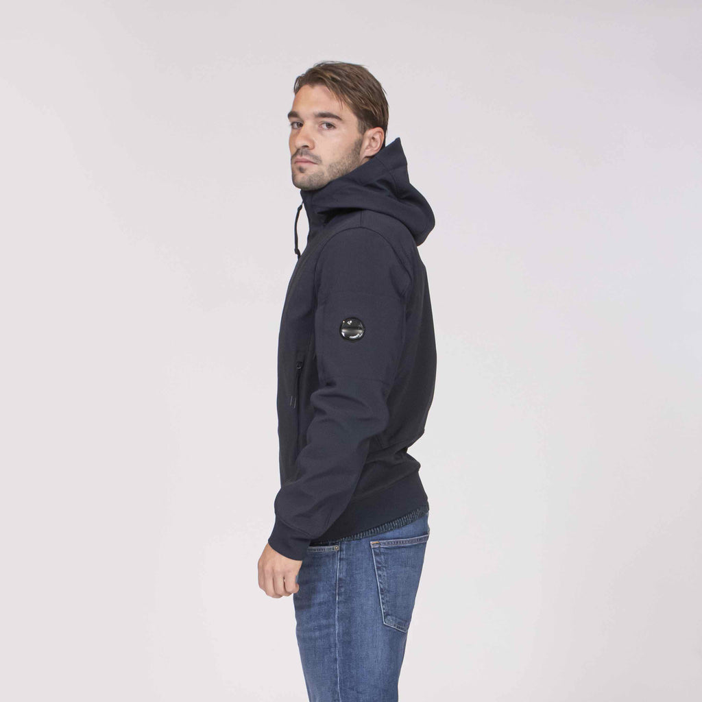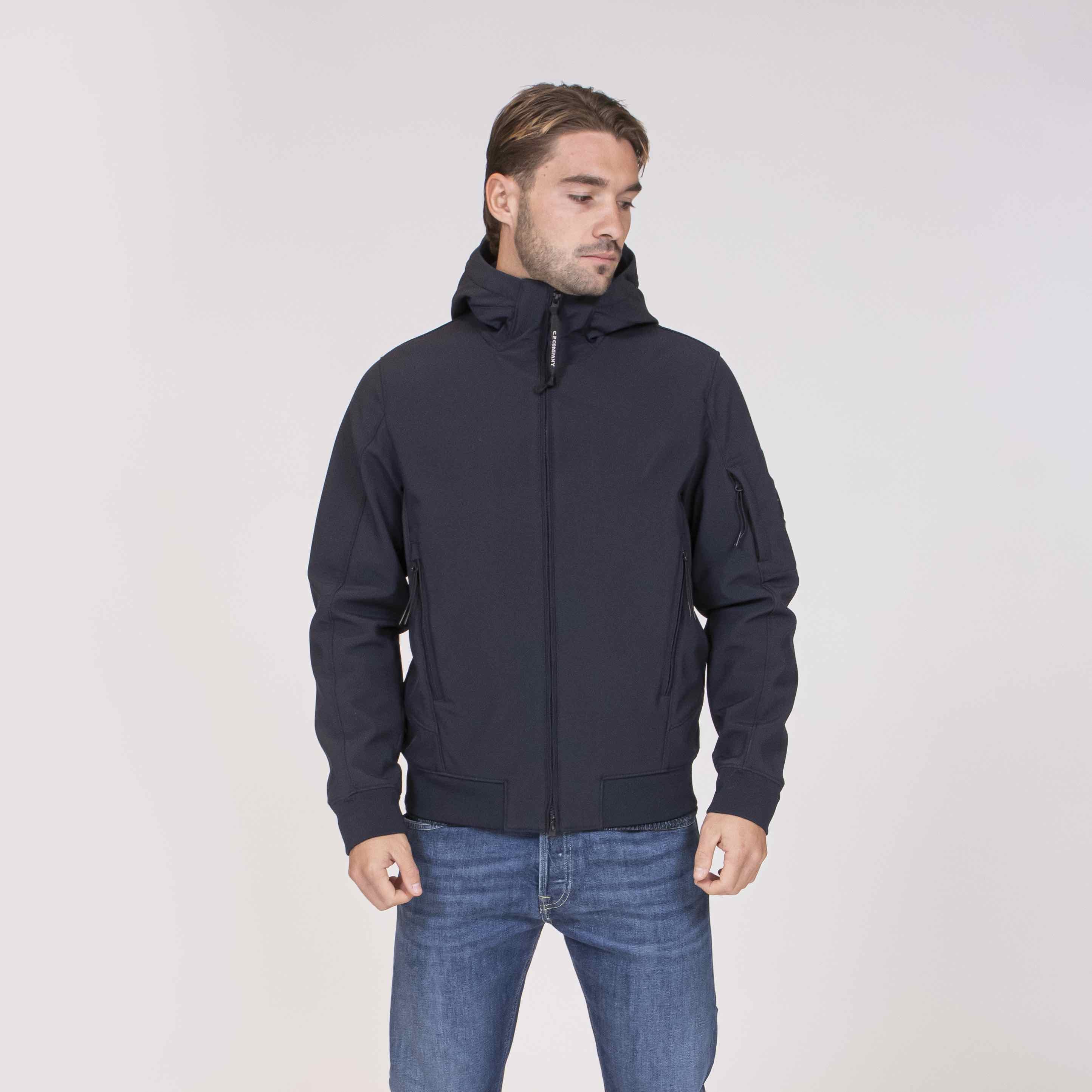Giacca con cappuccio realizzata in C.P. Shell-R, un softshell stretch a 3 strati in poliestere multifilamento riciclato, certificato secondo il Global Recycled Standard (GRS). Dotata di cappuccio regolabile, chiusura full zip a doppio cursore, tasche laterali con zip e l’iconica Lente di C.P. Company. I polsini e l'orlo posteriore a costine completano il design. Resistente per una colonna d’acqua di 5000 mm, garantendo protezione antivento. Trattato anti-goccia. Regular fit.