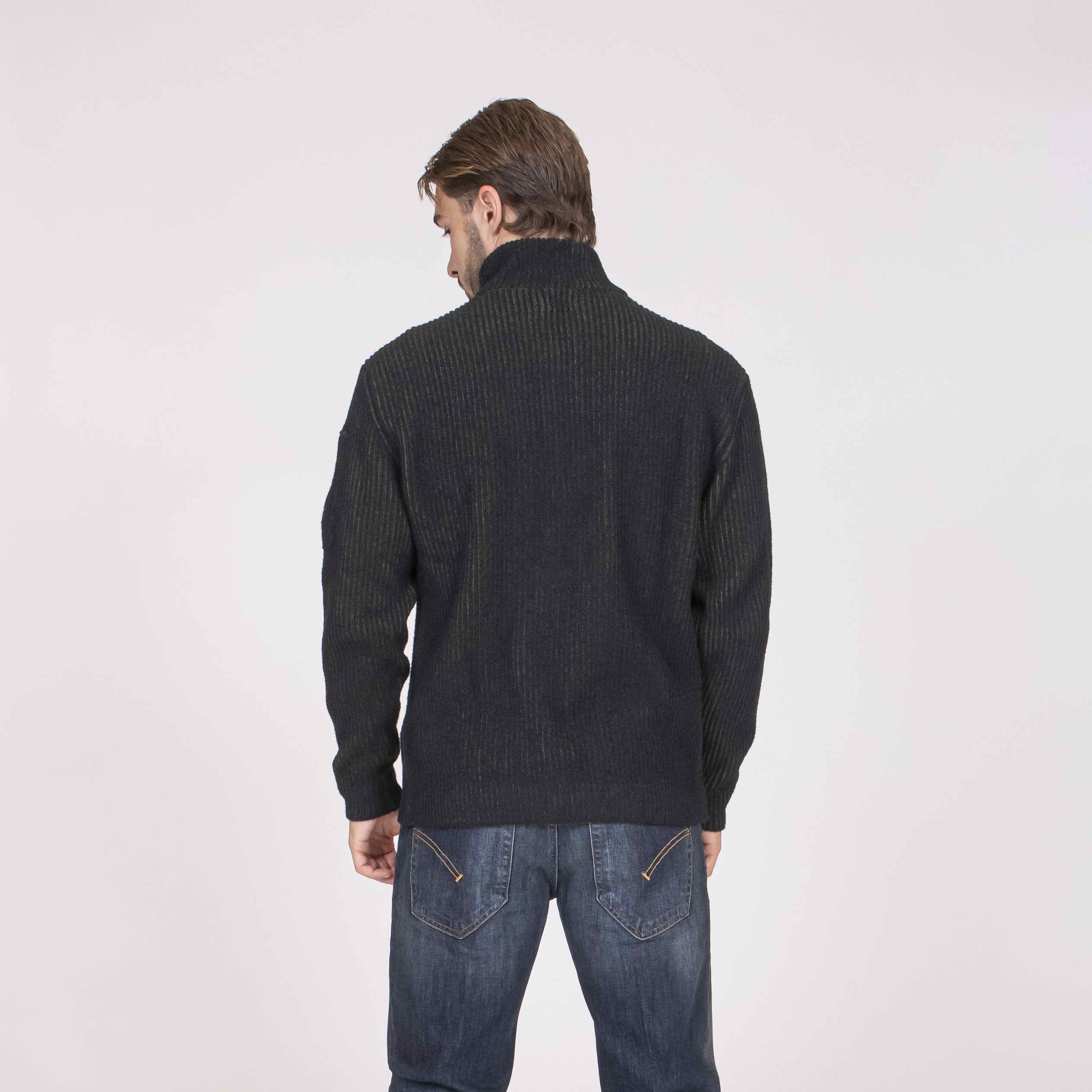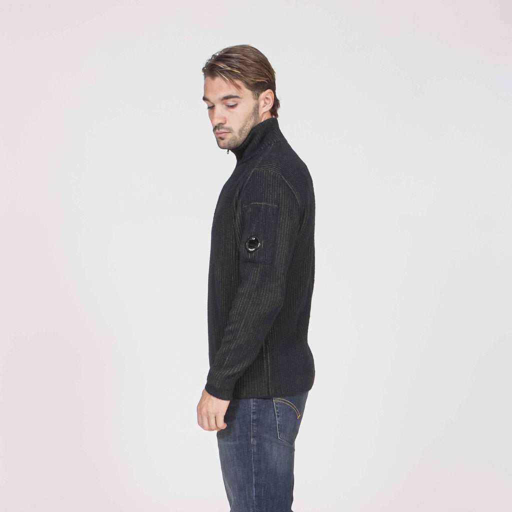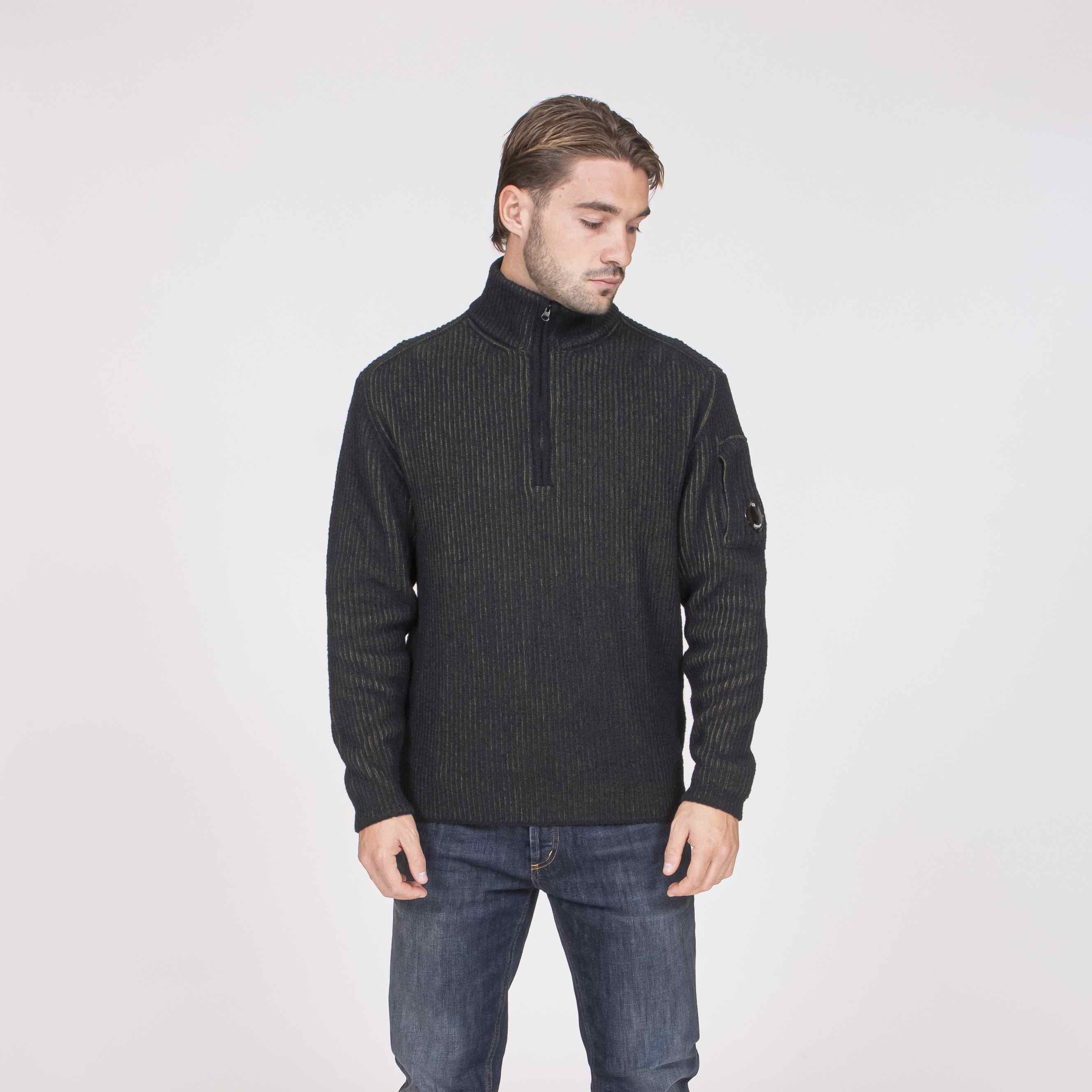 Maglione half zip realizzato in lana vanisé con ciniglia di poliestere a contrasto. Il modello presenta colletto a coste e l’iconica Lente di C.P. Company. Finezza 7. Regular fit.