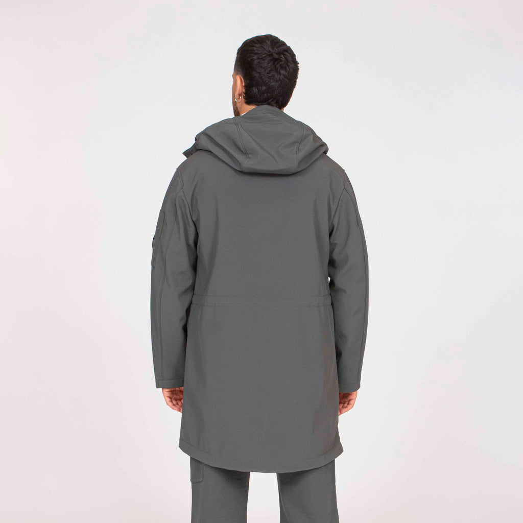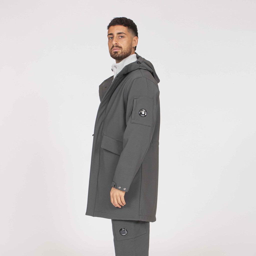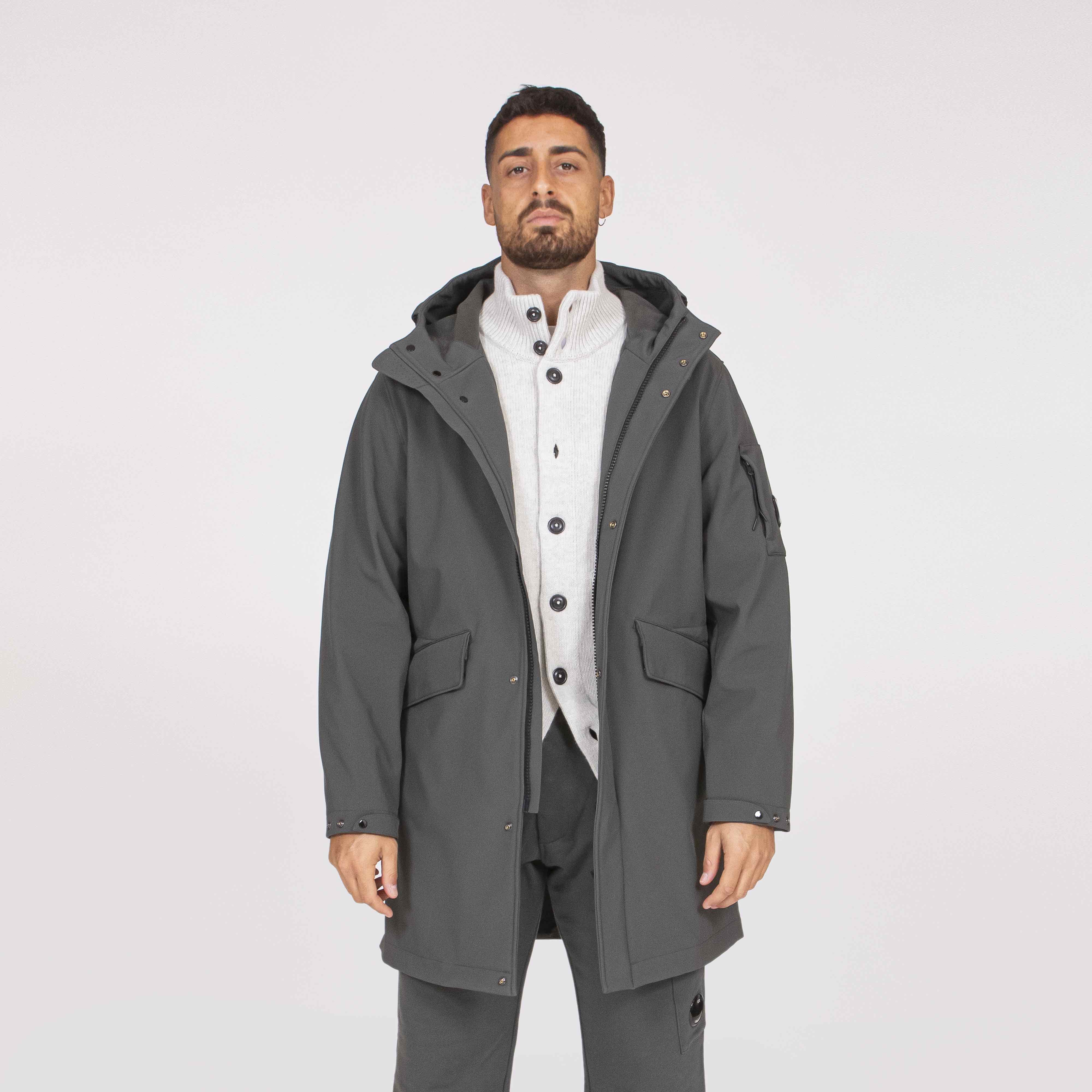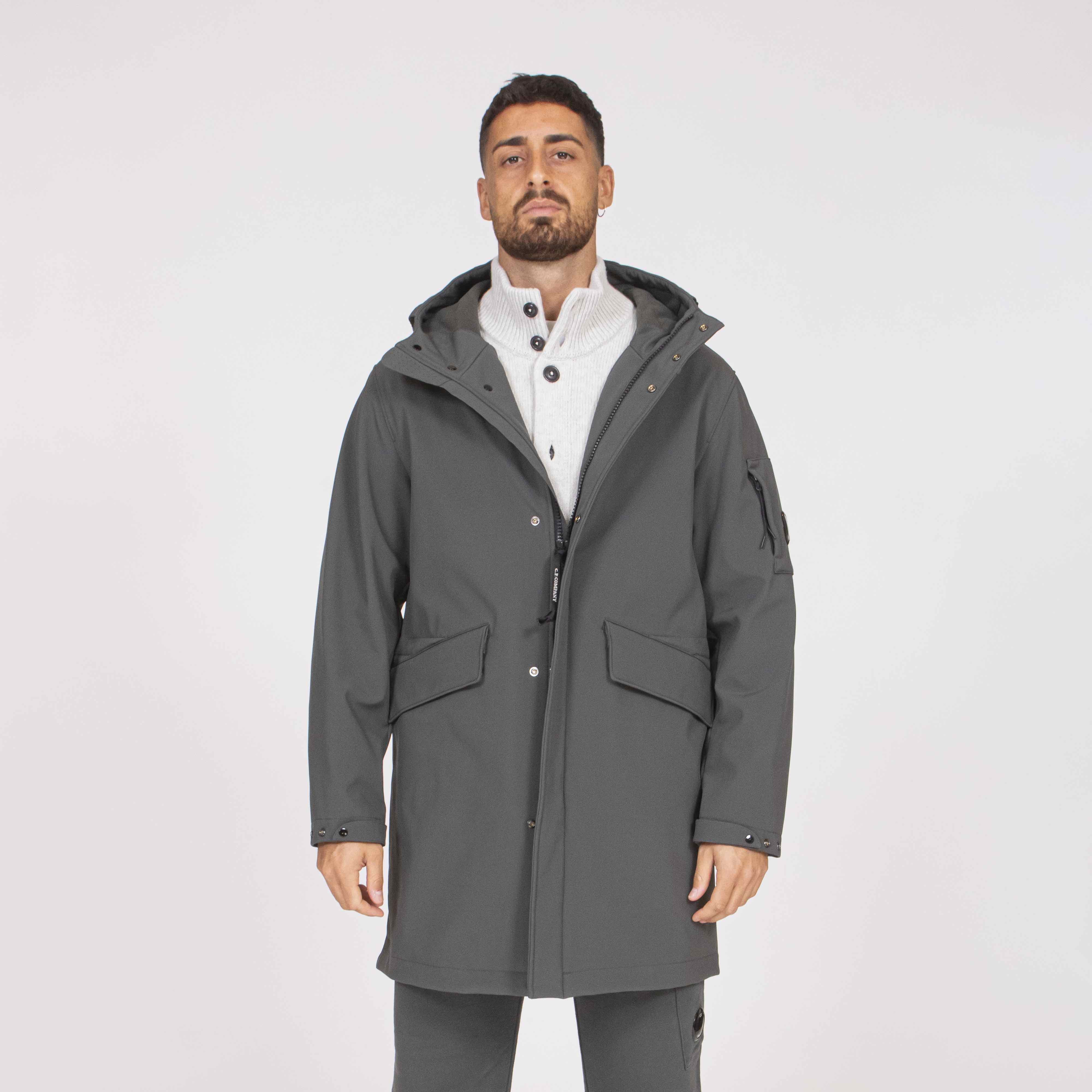 Parka con cappuccio realizzato in C.P. Shell-R, un softshell stretch a 3 strati in poliestere multifilamento riciclato, certificato secondo il Global Recycled Standard (GRS). Dotato di cappuccio regolabile, chiusura full zip nascosta da patta con bottoni automatici, tasche frontali con patta e bottoni automatici e l’iconica Lente di C.P. Company. Completano il capo i polsini regolabili. Resistente per una colonna d’acqua di 5000 mm, garantendo protezione antivento. Trattato anti-goccia. Regular fit.
