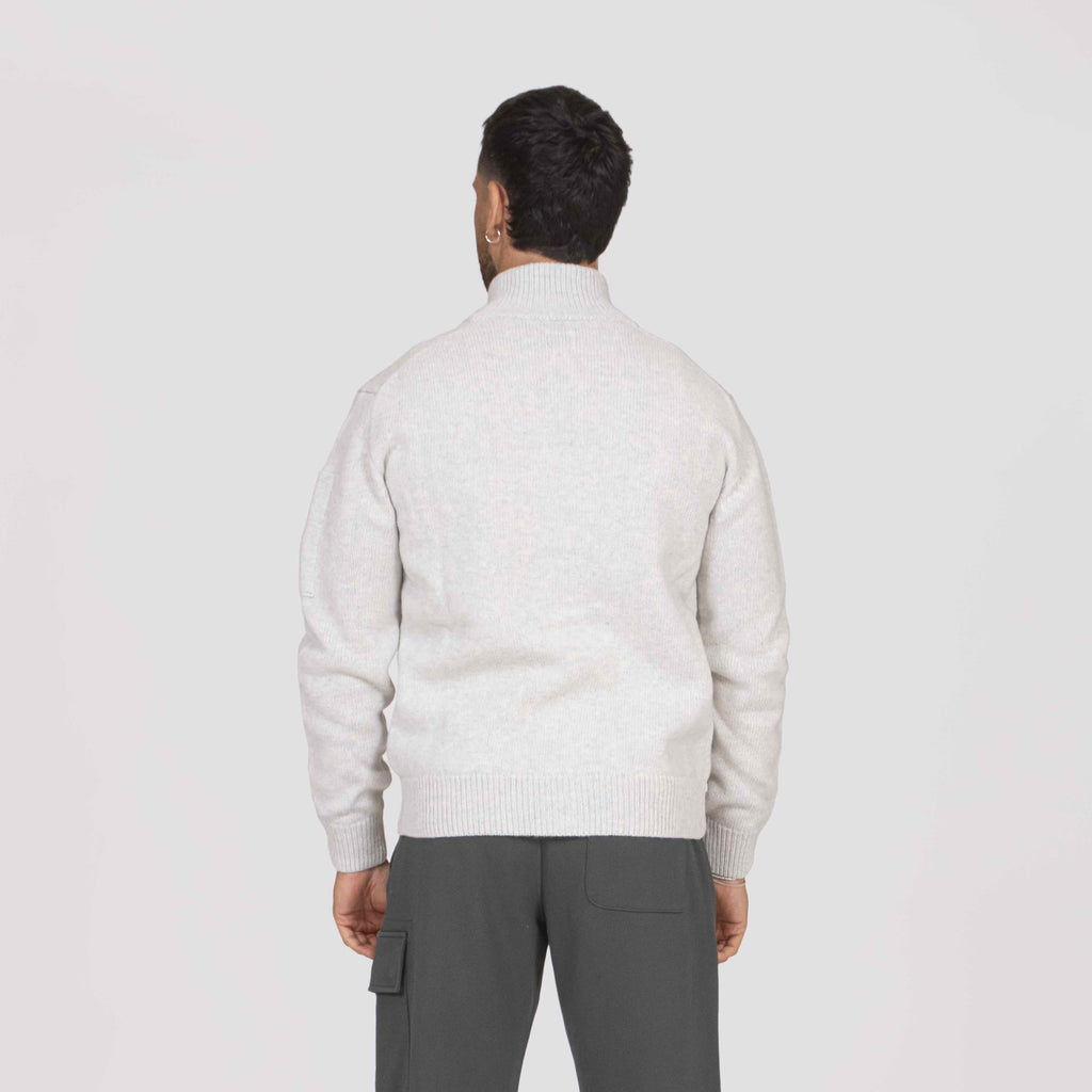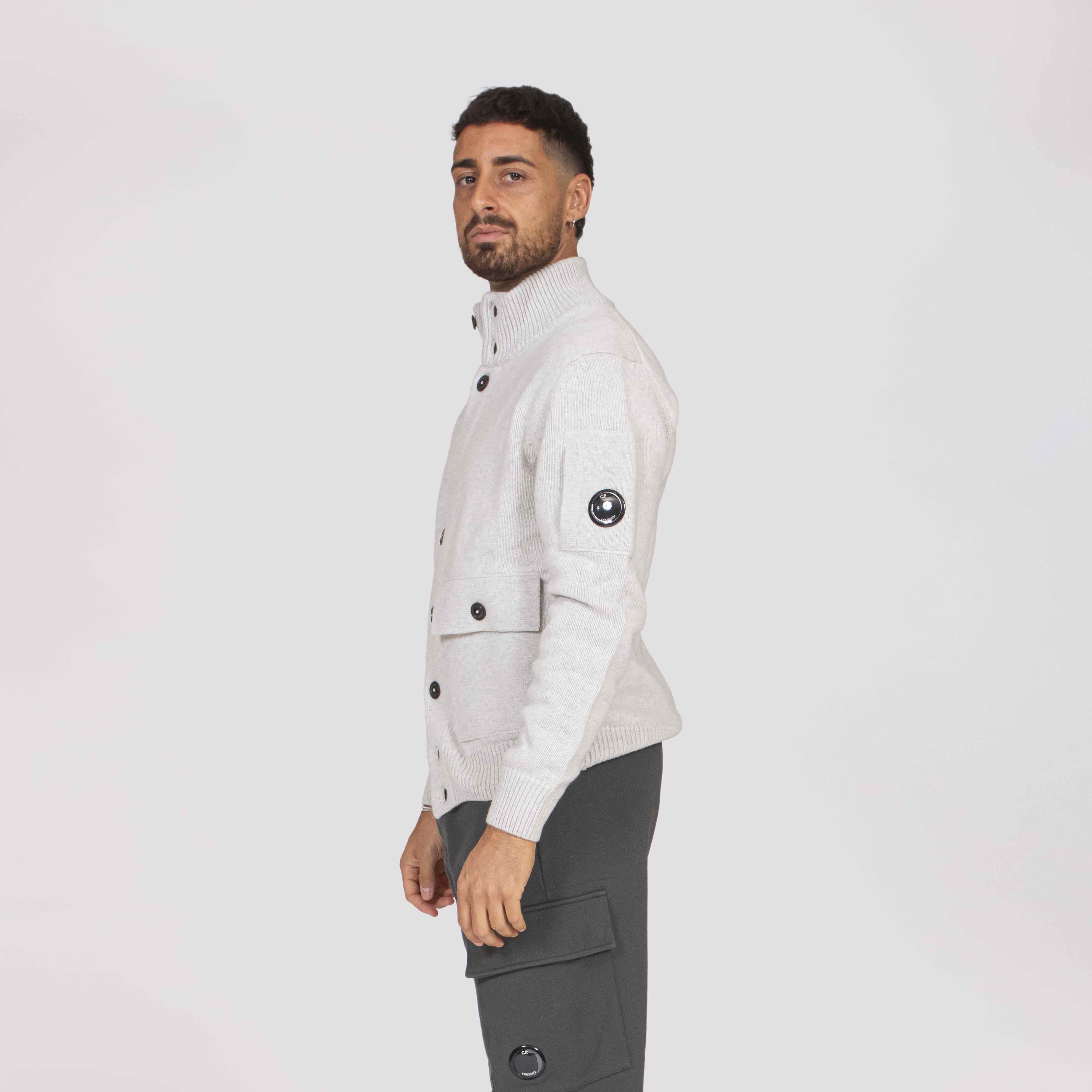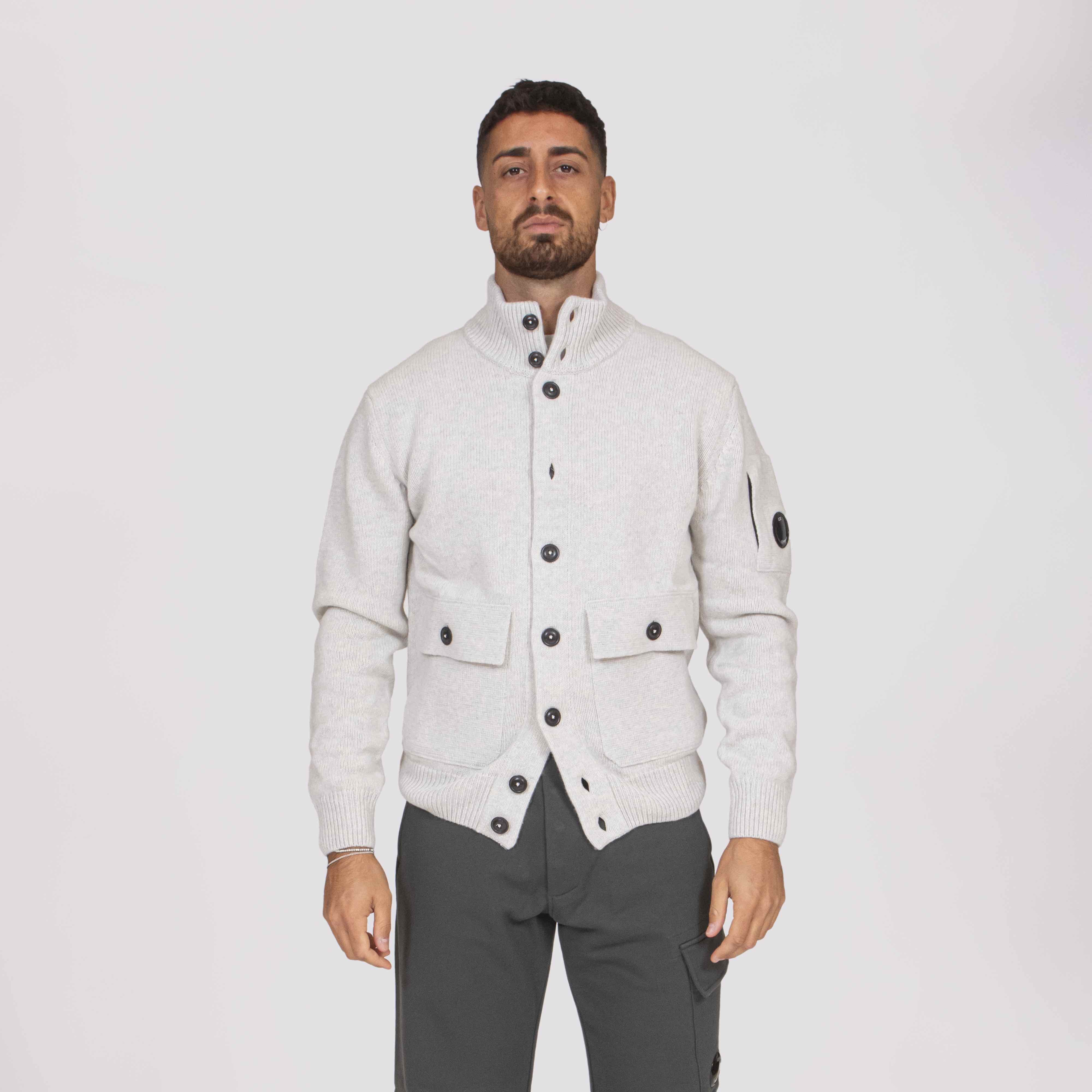 Maglione con chiusura a bottoni realizzato in Lambswool GRS. La certificazione Global Recycled Standard garantisce il rispetto di criteri ambientali e sociali in tutte le fasi della filiera. Il capo presenta collo a costine, tasche con bottoni e l’iconica Lente di C.P. Company. Finezza 5. Regular fit.