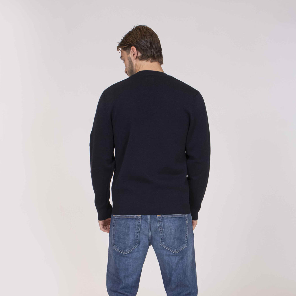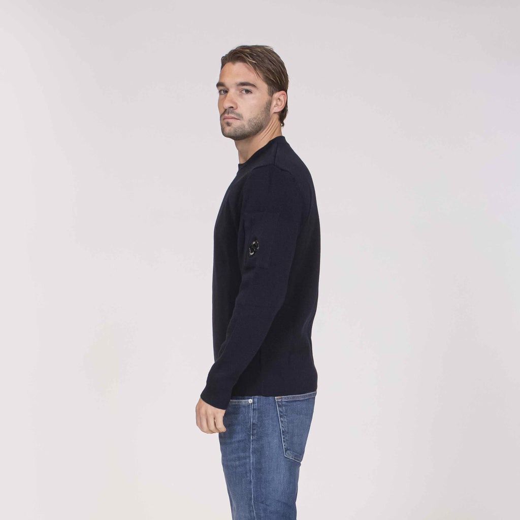 Maglione girocollo realizzato in Re-Wool, un tessuto misto di lana merino extrafine certificata Responsible Wool Standard (RWS) e poliestere riciclato certificato Global Recycled Standard (GRS). Il modello è arricchito dall’iconica Lente di C.P. Company, polsini e orlo a costine. Finezza 12. Regular fit.