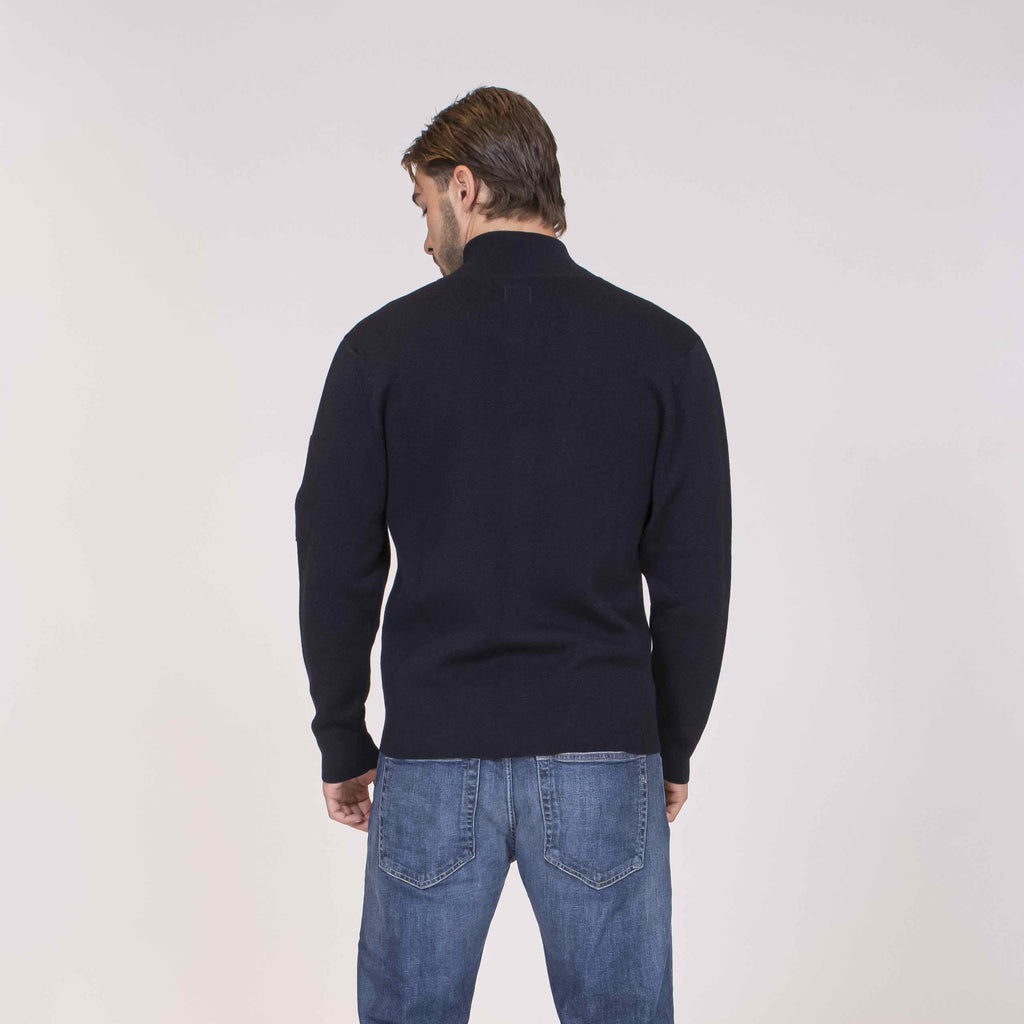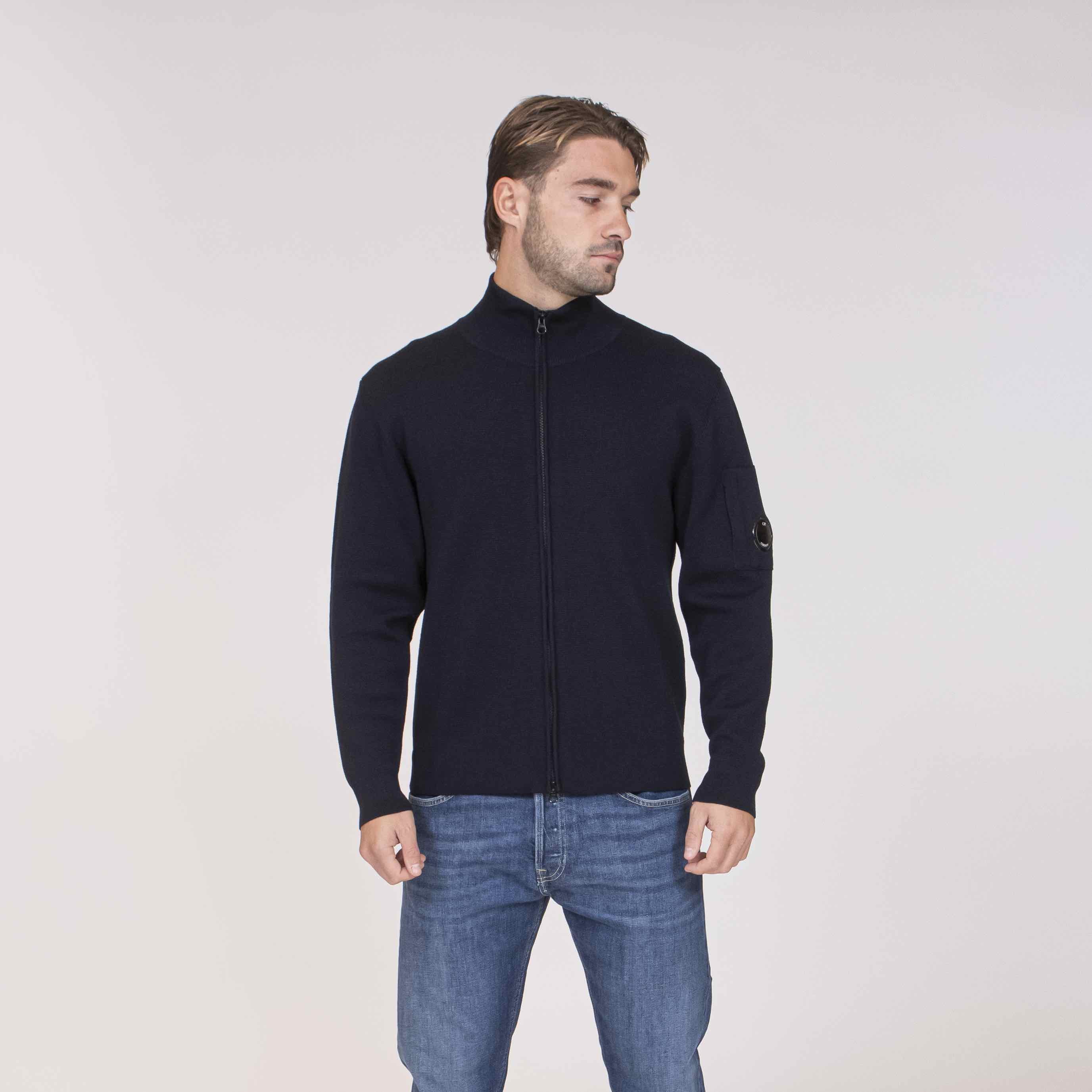 Cardigan full zip realizzato in Re-Wool, un tessuto misto di lana merino extrafine certificata Responsible Wool Standard (RWS) e poliestere riciclato certificato Global Recycled Standard (GRS). Il modello presenta collo a costine e l’iconica Lente di C.P. Company. Rifinito con polsini e orlo a costine. Finezza 12. Regular fit.