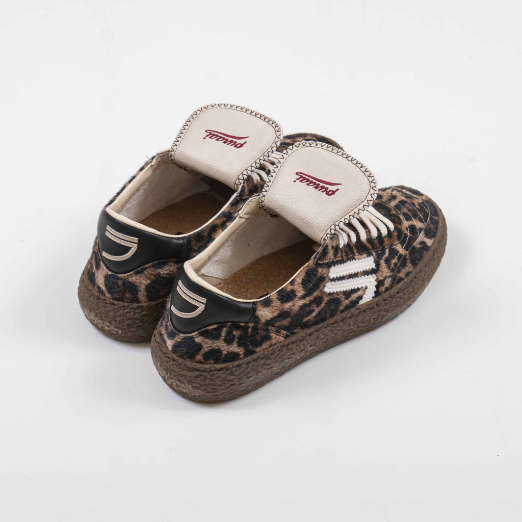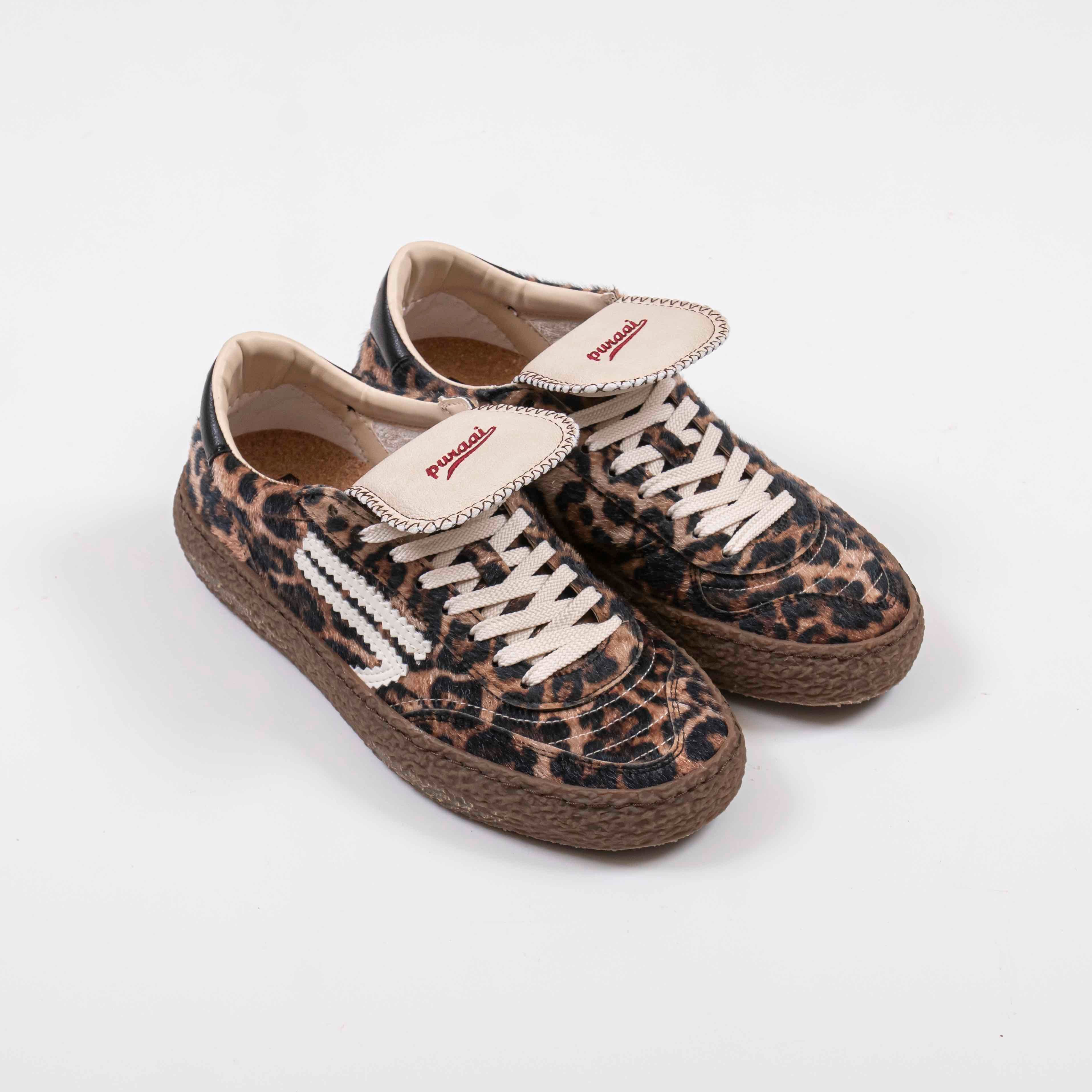 Le Puraai Polly Jaguar sono sneakers basse dal carattere deciso, realizzate in pelle vegana effetto pony con stampa jaguar. Questo design audace è arricchito da dettagli in nero, tra cui il logo laterale e la linguetta sul tallone. La suola in gomma color miele e le doppie stringhe, una nera e una con stampa leopardata, completano il look, conferendo un tocco originale e distintivo.